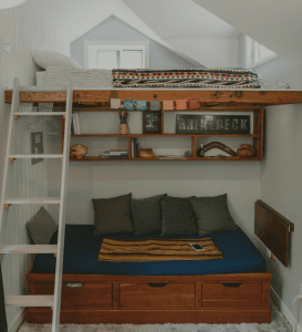 Maximising space in an off-grid tiny home requires innovative storage solutions. Utilise vertical space with shelving and wall-mounted cabinets. Consider built-in storage options, such as drawers or shelves underneath stairs, window nooks with storage underneath or clever coffee tables with storage compartments. Hanging racks, hooks, and door hangers can also help keep your space organised and clutter-free.